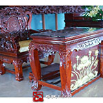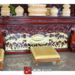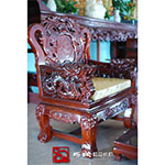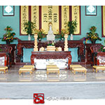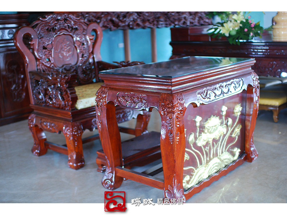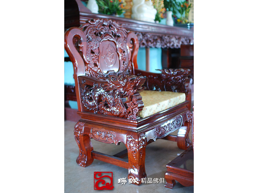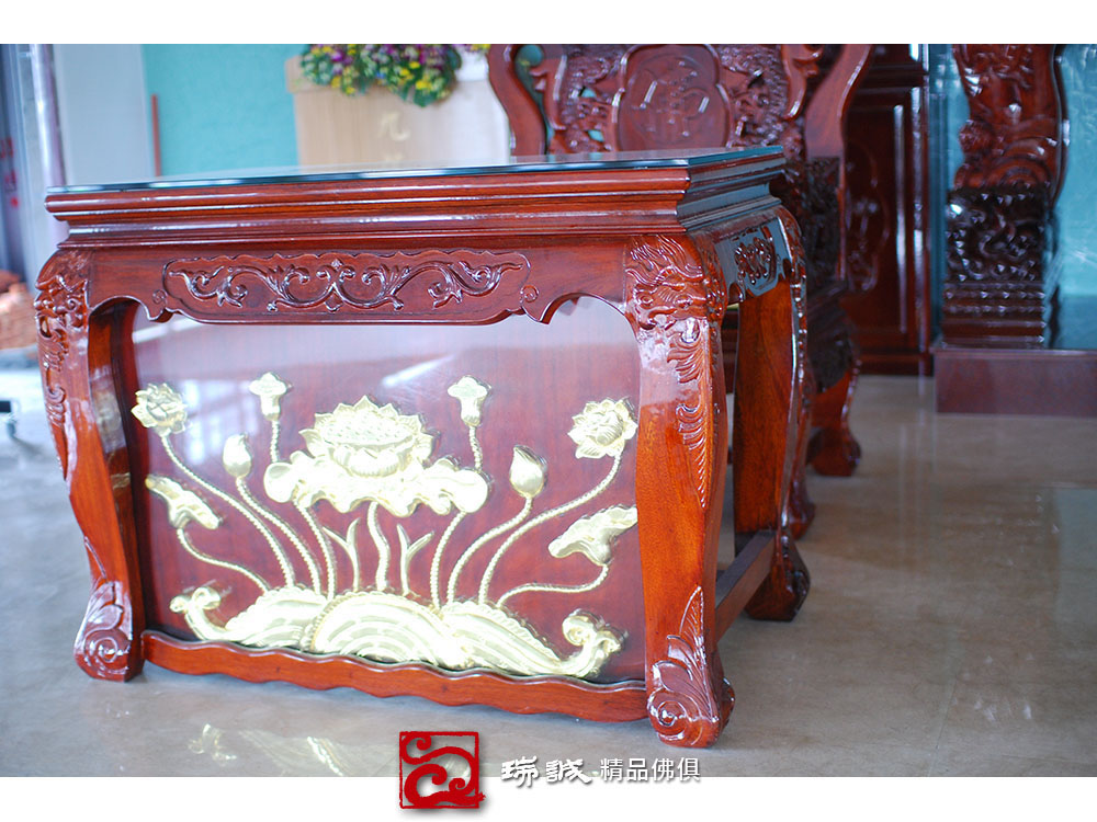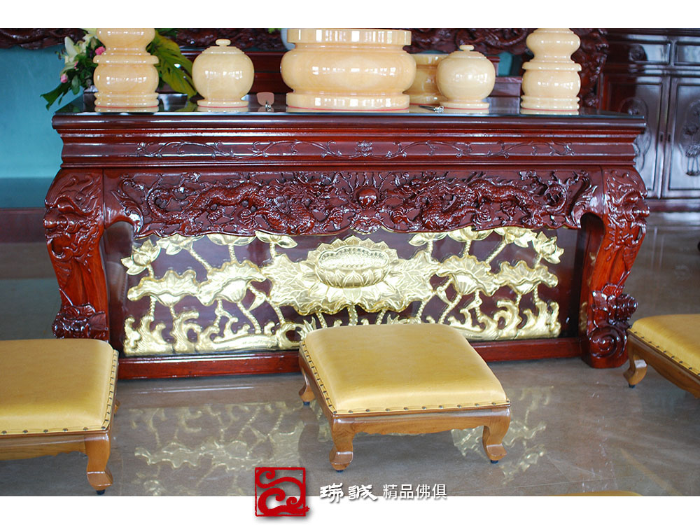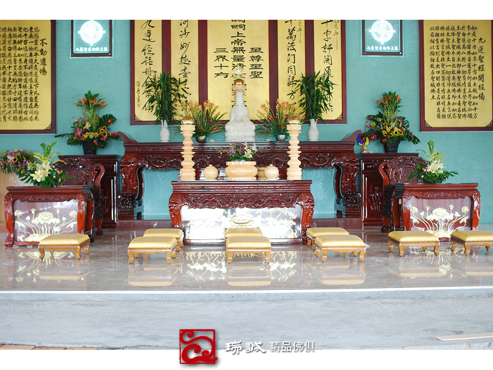 高雄市大寮區蕭先生大佛堂,上桌長114.5寸*寬29寸*高43.8寸,下桌長63.5寸*寬51寸*高26.7寸,全組黃花梨深雕雙龍,左右兩側配花梨深雕雙龍仙佛椅桌。