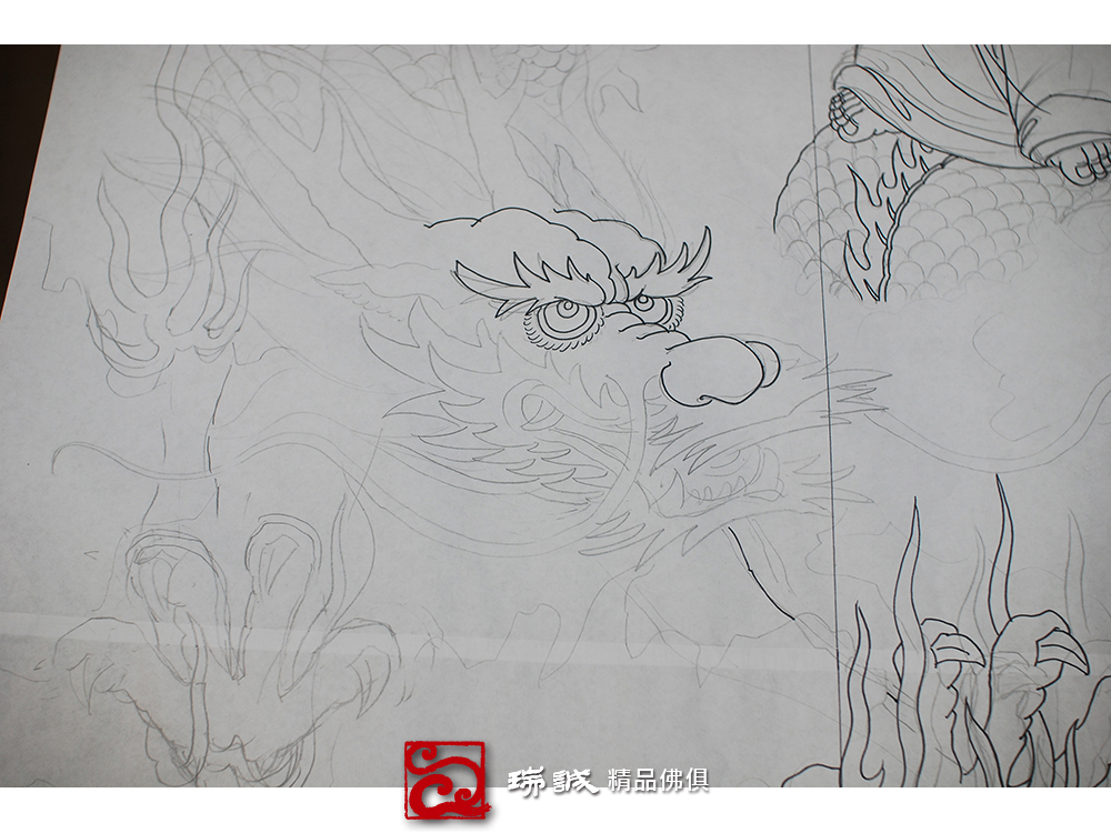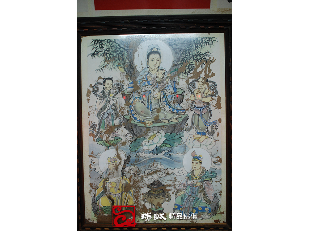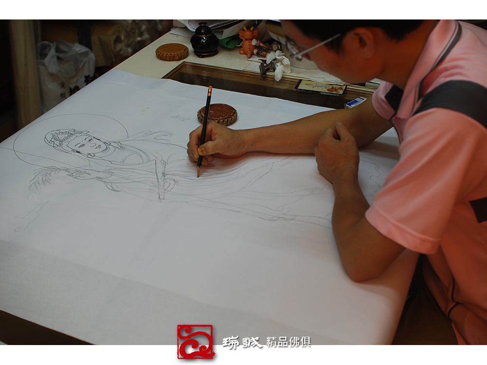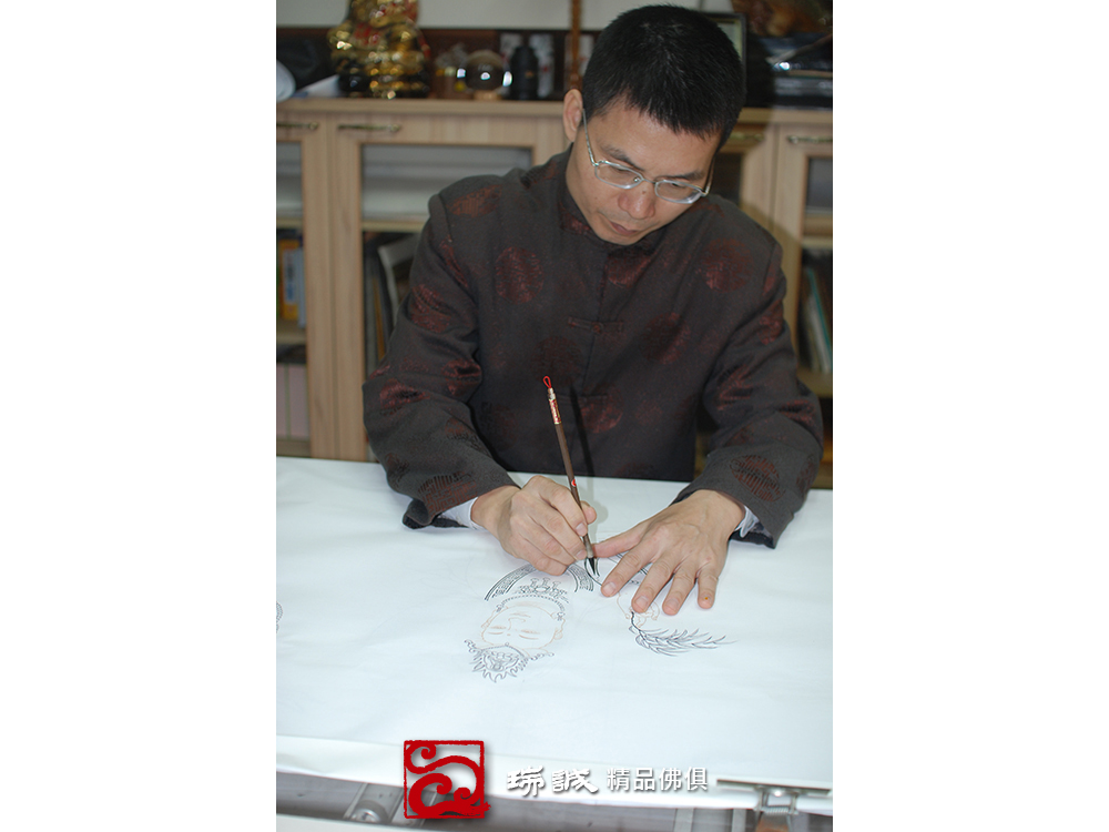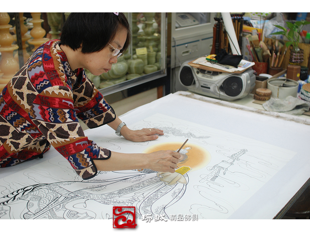此畫委託人高雄市橋頭區鄧太太,家裡神明廳佛像已嚴重蛀蟲且髒污不堪,經由朋友介紹找到阿玄,希望能依照原有祖傳的觀音佛像樣子再重畫一幅。阿玄拍照參考並重新擬稿,以求盡可能維持原貌。祖傳的佛像,老太太已有濃厚感情,精神上的寄託不是金錢的多寡所能換來,阿玄完成了鄧老太太的心願,感謝上天!