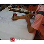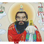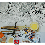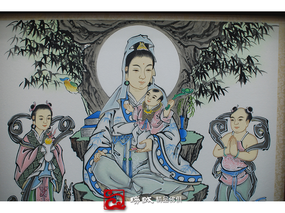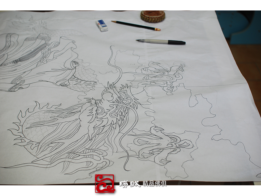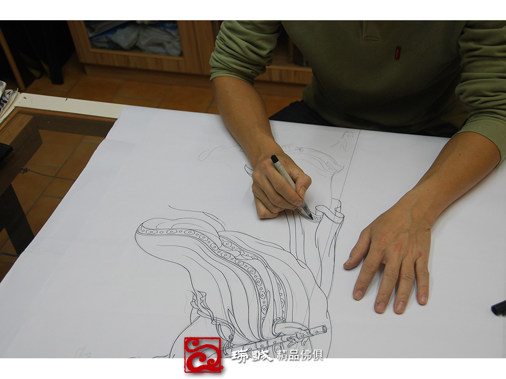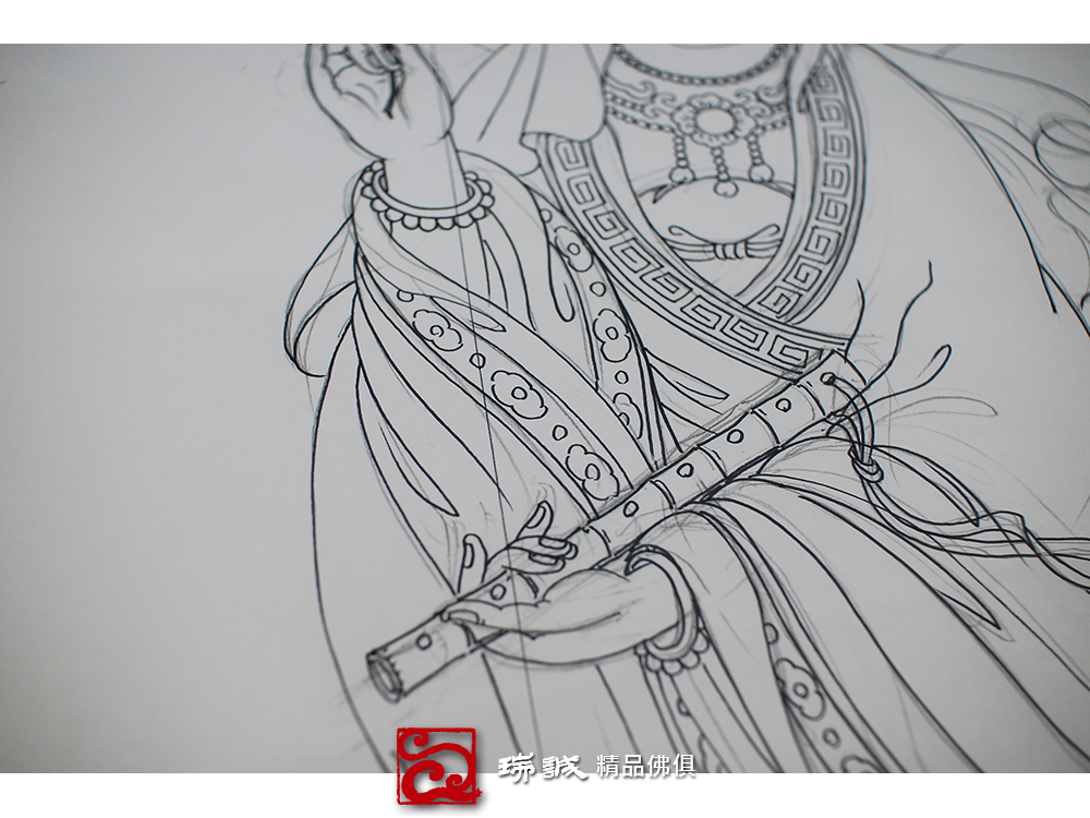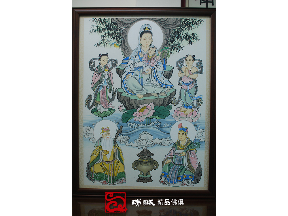 此畫委託人高雄市橋頭區鄧太太,家裡神明廳佛像已嚴重蛀蟲且髒污不堪,經由朋友介紹找到阿玄,希望能依照原有祖傳的觀音佛像樣子再重畫一幅。阿玄拍照參考並重新擬稿,以求盡可能維持原貌。祖傳的佛像,老太太已有濃厚感情,精神上的寄託不是金錢的多寡所能換來,阿玄完成了鄧老太太的心願,感謝上天!