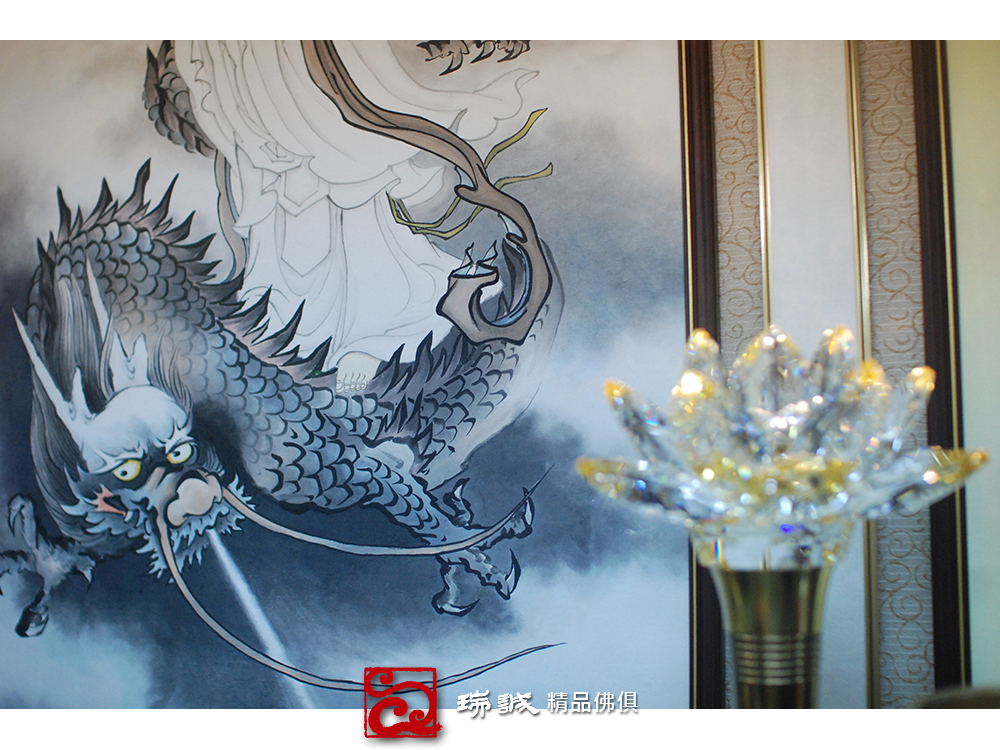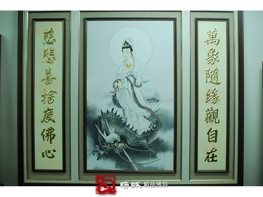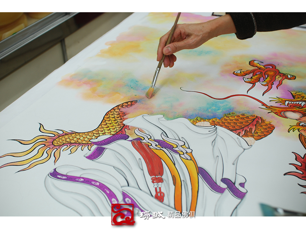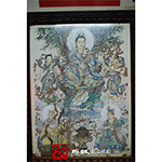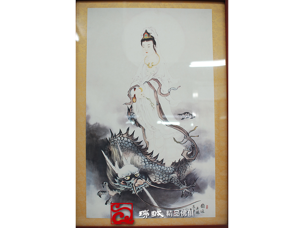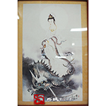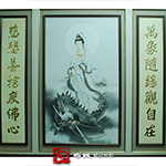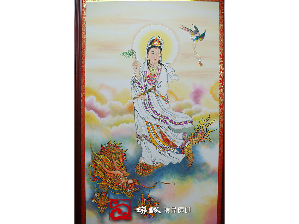 此幅為高雄市左營陳小姐結緣,此畫的內涵主要是依陳小姐源自於觀世音菩薩特殊因緣的形象示現的描述,再經由阿玄的心領神會,一筆一畫慢慢浮現於紙上。期間與陳小姐也有數次討論修改才定稿。觀音臉頰細緻,眼睛年輕有光彩通幅以紫金色為主色調,騎龍觀音穿雲霧而出,搭配遠景雲彩,非常有空間感,真是神采飛揚躍然紙上。