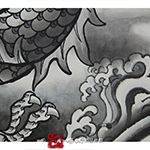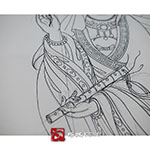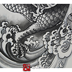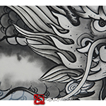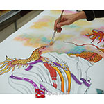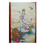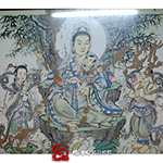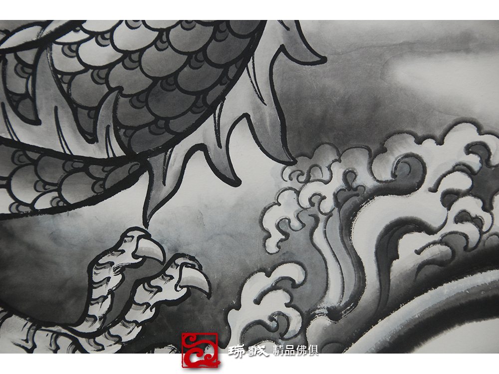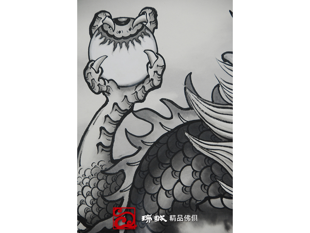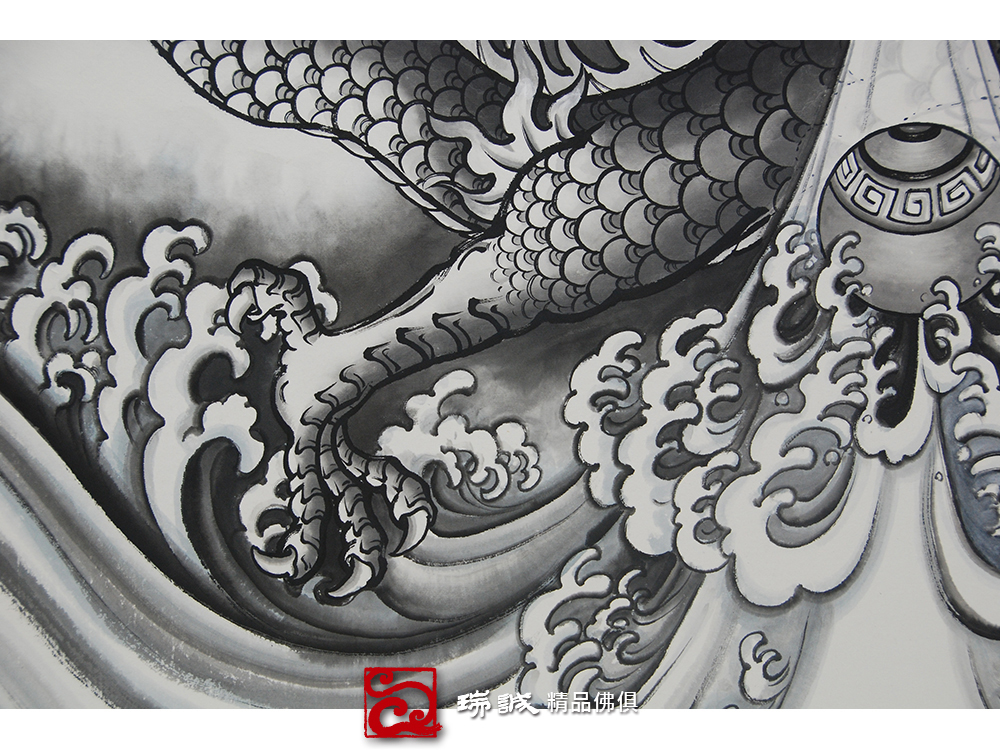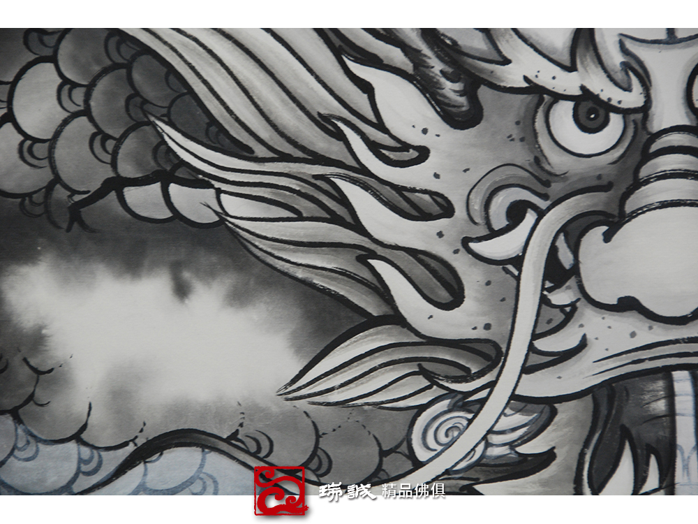 此幅為高雄市左營陳小姐結緣,此畫的內涵主要是依陳小姐源自於觀世音菩薩特殊因緣的形象示現的描述,再經由阿玄的心領神會,一筆一畫慢慢浮現於紙上。期間與陳小姐也有數次討論修改才定稿。觀音臉頰細緻,眼睛年輕有光彩通幅以紫金色為主色調,騎龍觀音穿雲霧而出,搭配遠景雲彩,非常有空間感,真是神采飛揚躍然紙上。