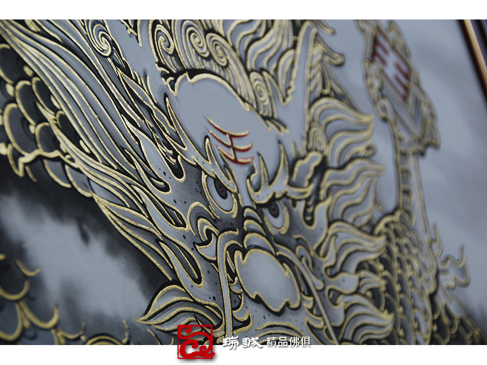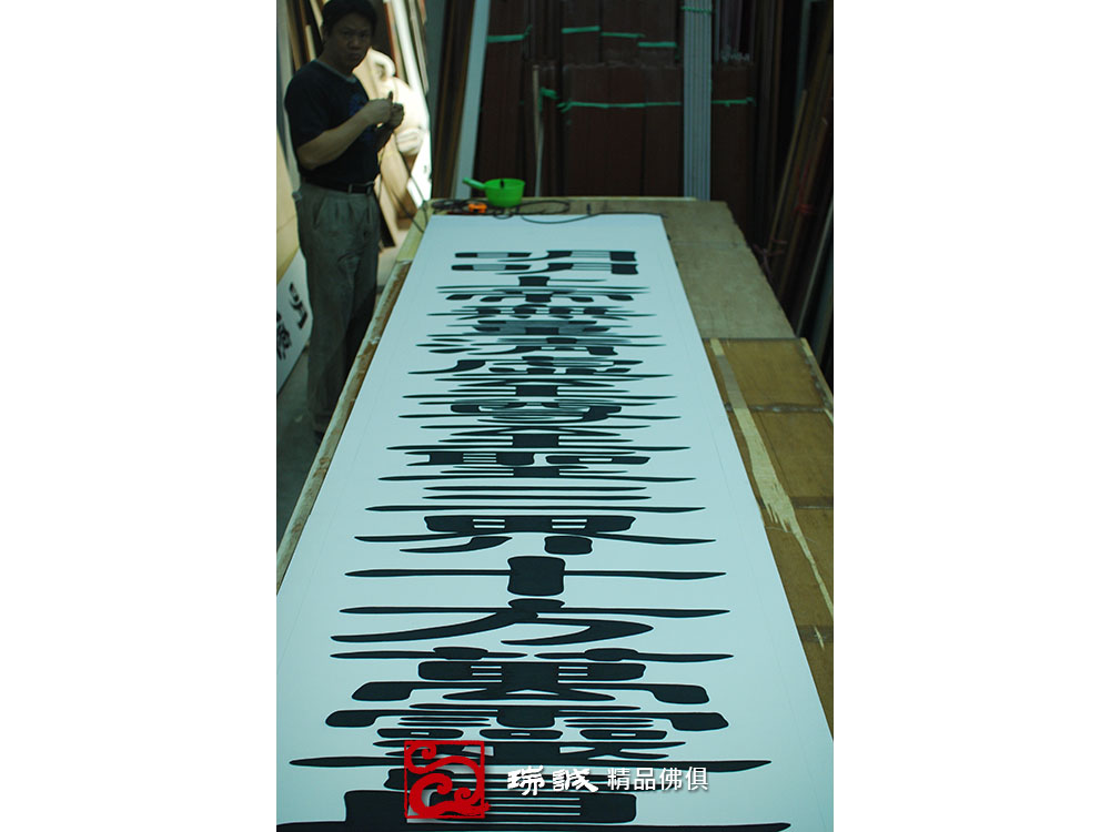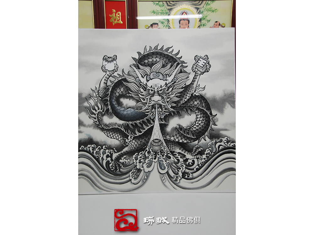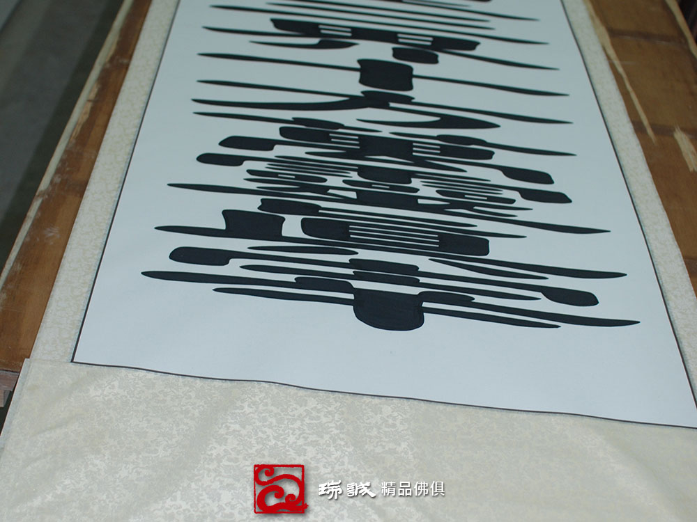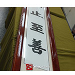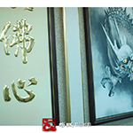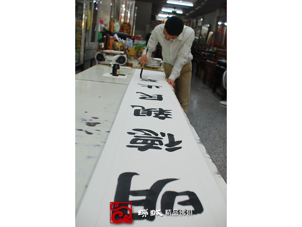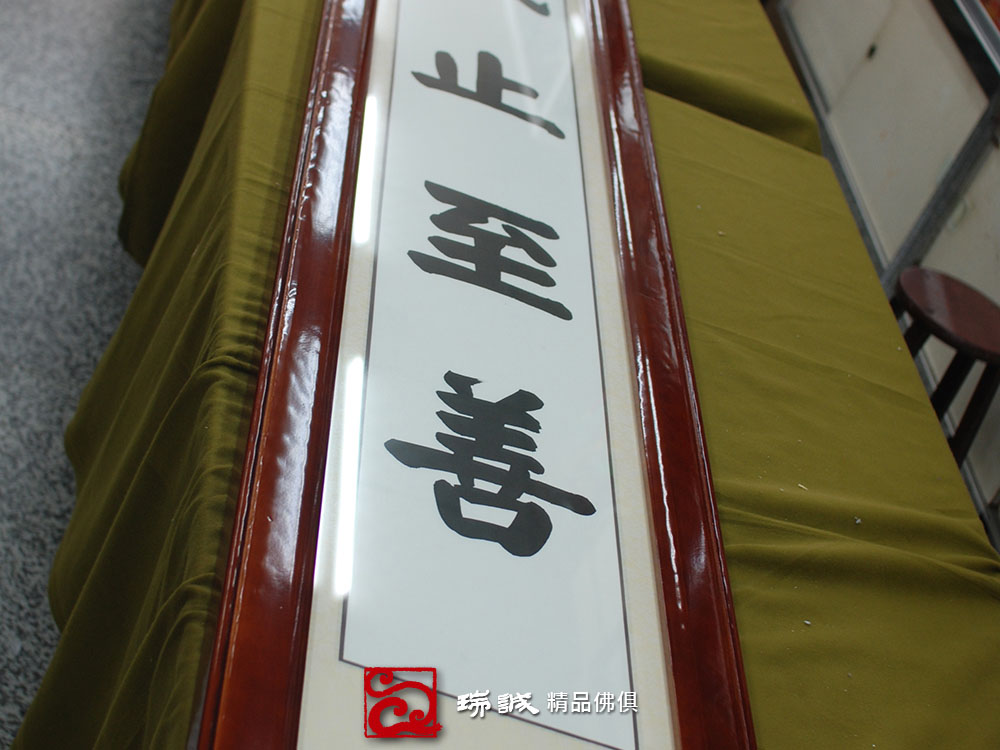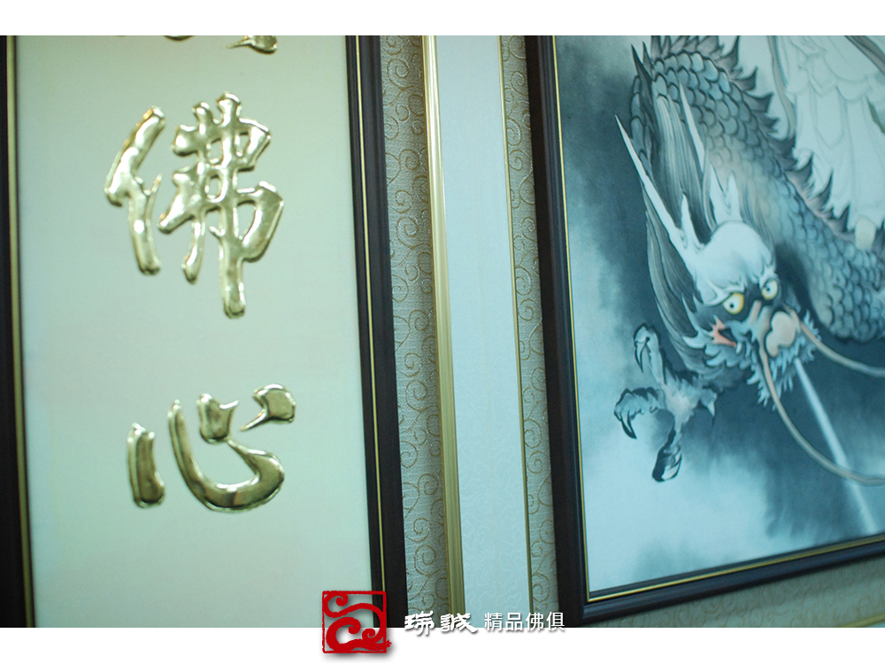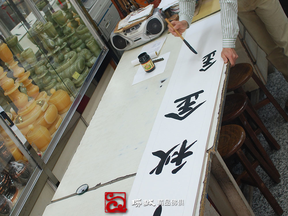 此乃應高雄鳳山賴先生之訂做要求,為一件臨摹作品。一面欣賞別人優良畫作,一面考驗著自己的技巧能力,接案後戰戰兢兢,一筆一畫全神貫注,不一樣的挑戰,一樣的精神為之。配上手寫安金箔立體字及精緻裱框,再搭配賴先生選購的綠檀神桌及燈爐組合,真是絕無僅有的特殊美感!看到賴先生滿意歡喜的笑容,阿玄也覺得安心欣慰。