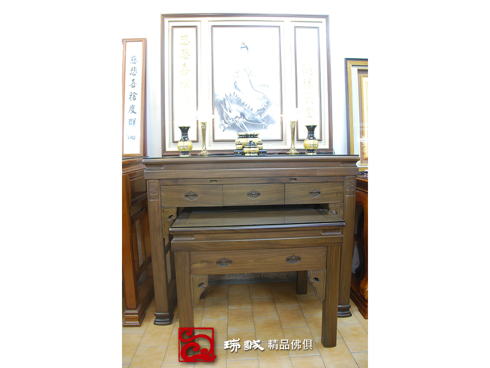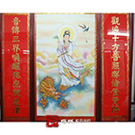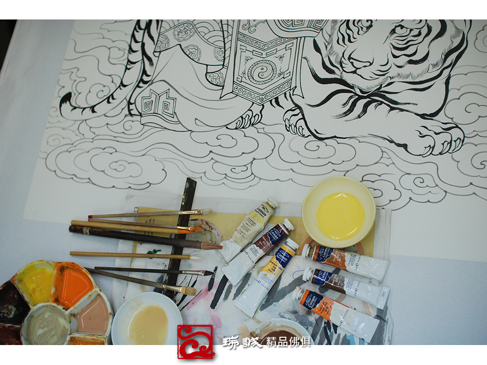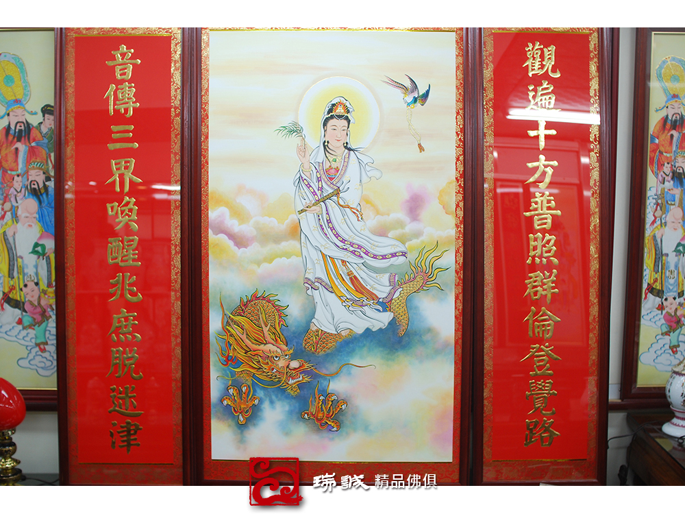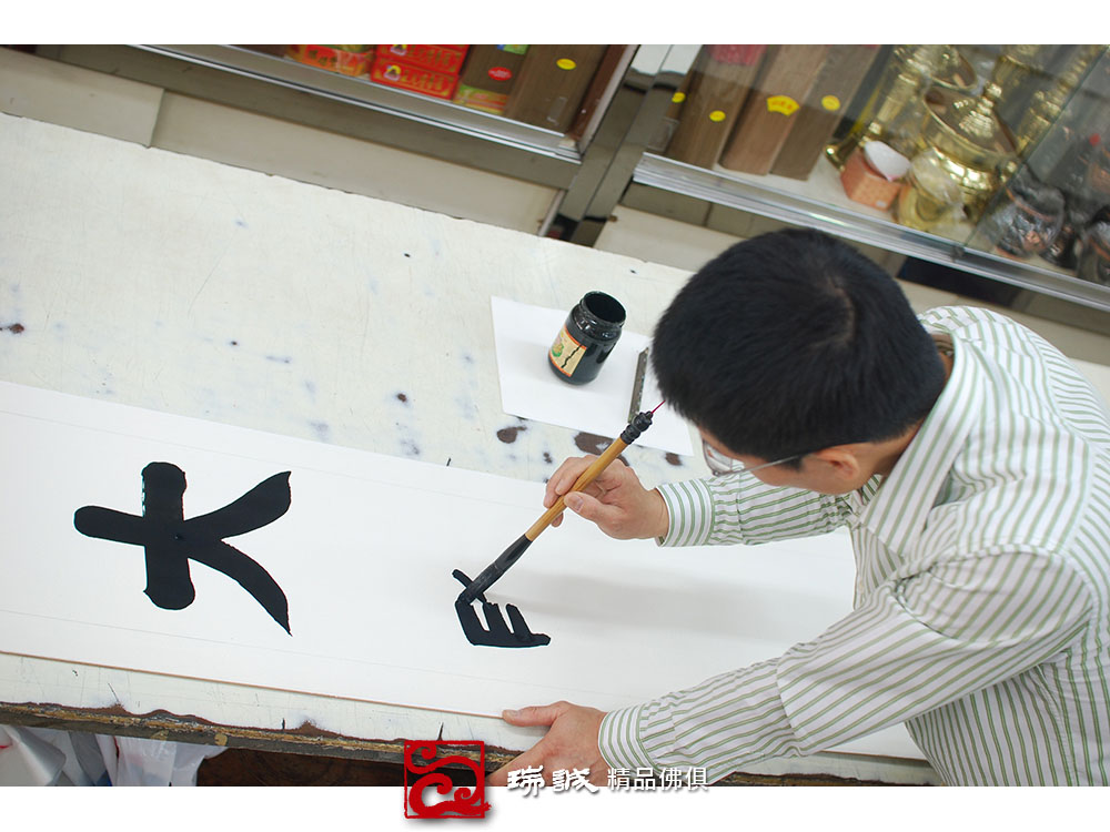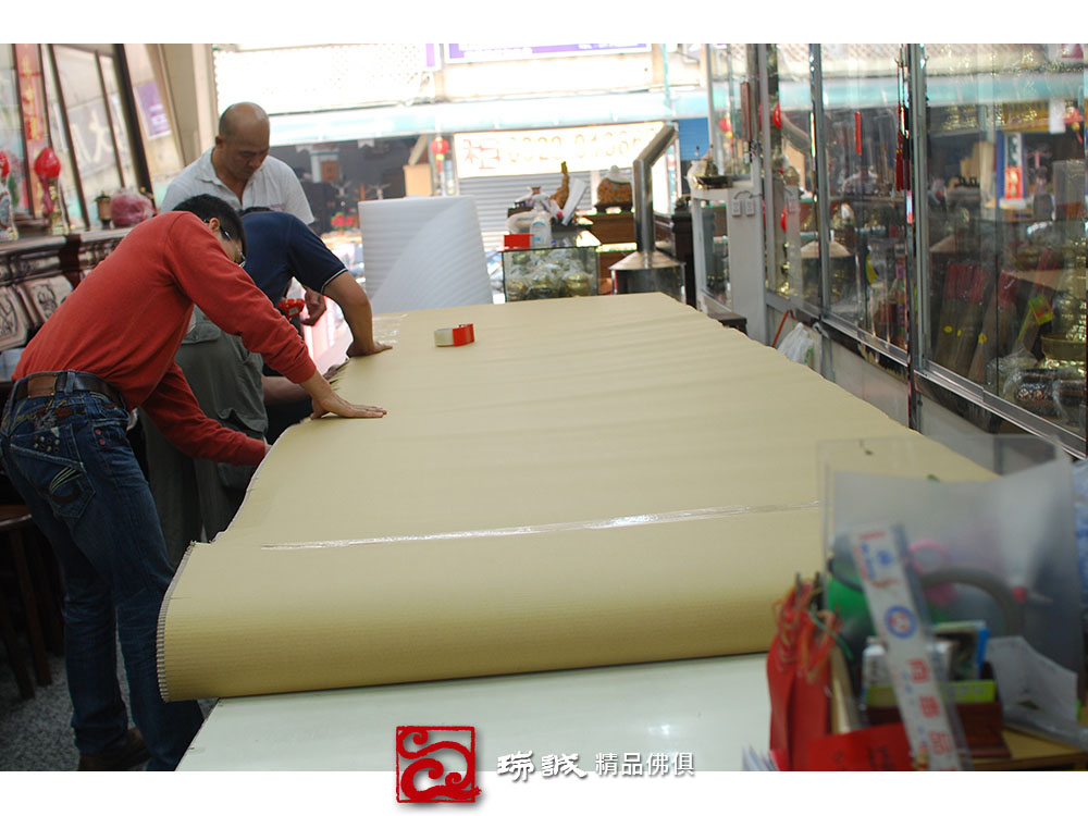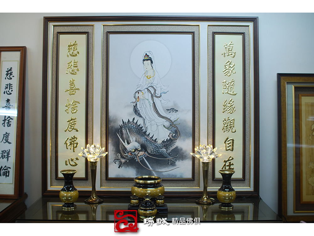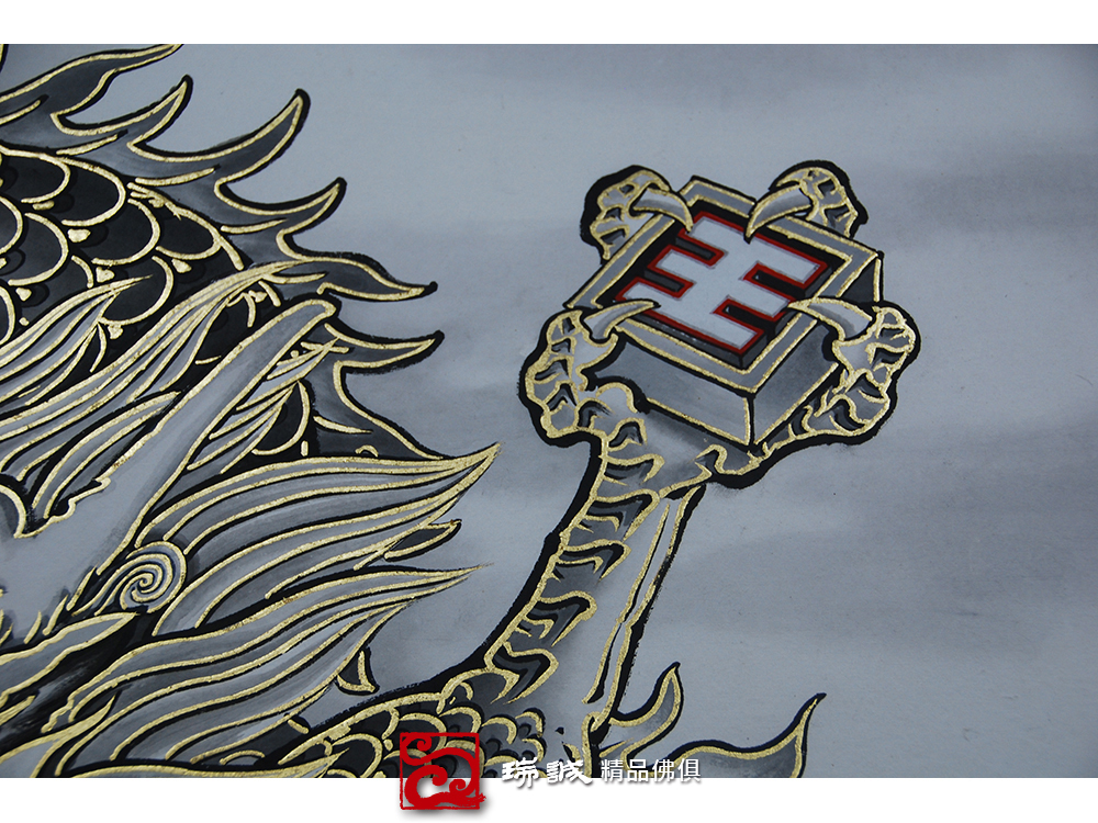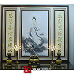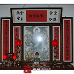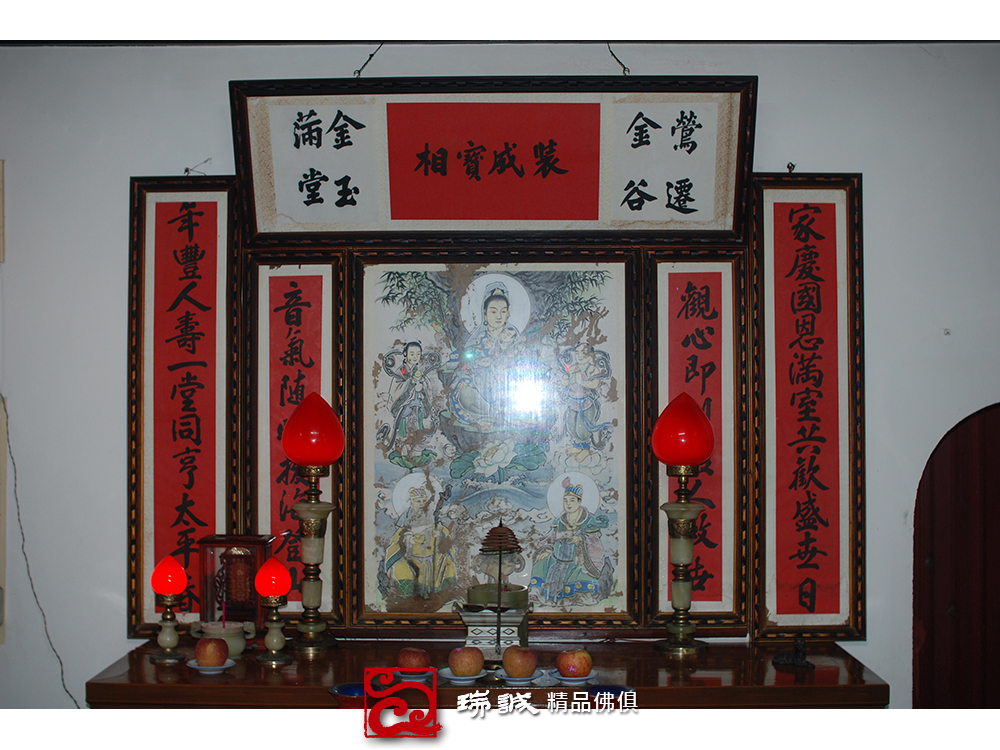 此乃應高雄鳳山賴先生之訂做要求,為一件臨摹作品。一面欣賞別人優良畫作,一面考驗著自己的技巧能力,接案後戰戰兢兢,一筆一畫全神貫注,不一樣的挑戰,一樣的精神為之。配上手寫安金箔立體字及精緻裱框,再搭配賴先生選購的綠檀神桌及燈爐組合,真是絕無僅有的特殊美感!看到賴先生滿意歡喜的笑容,阿玄也覺得安心欣慰。