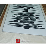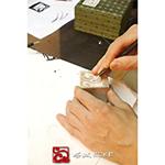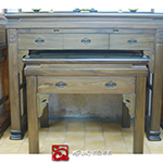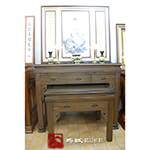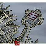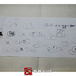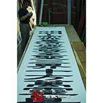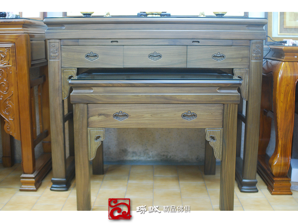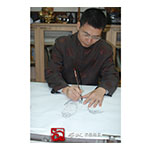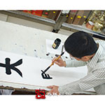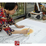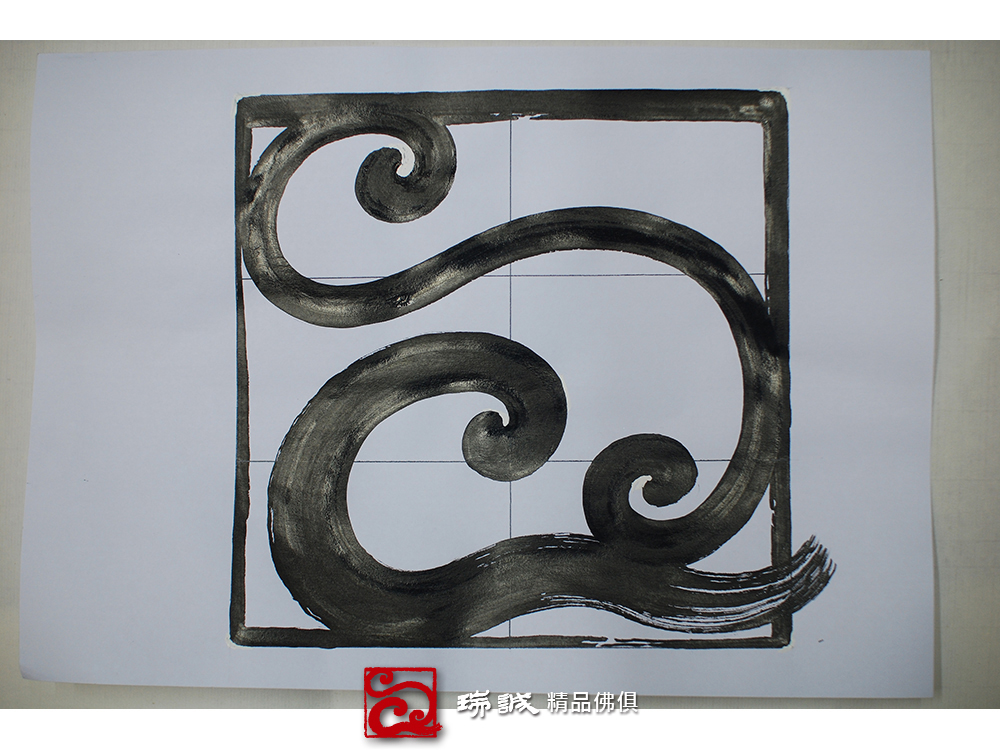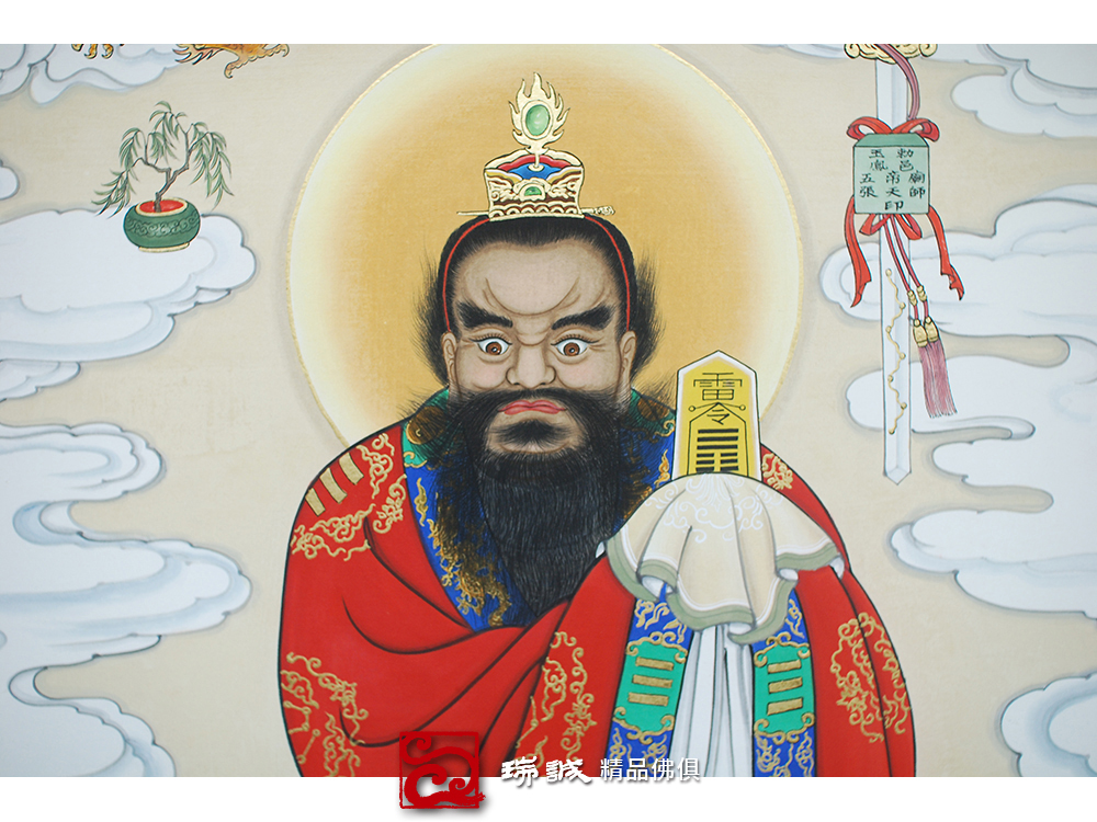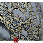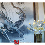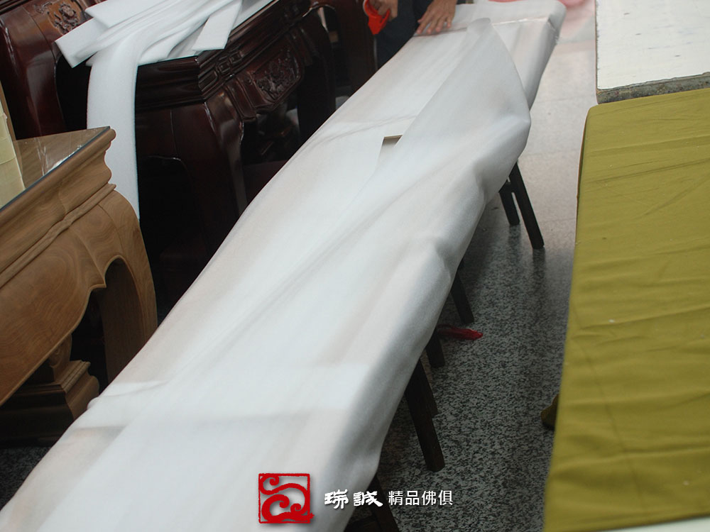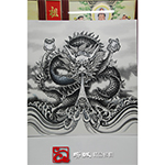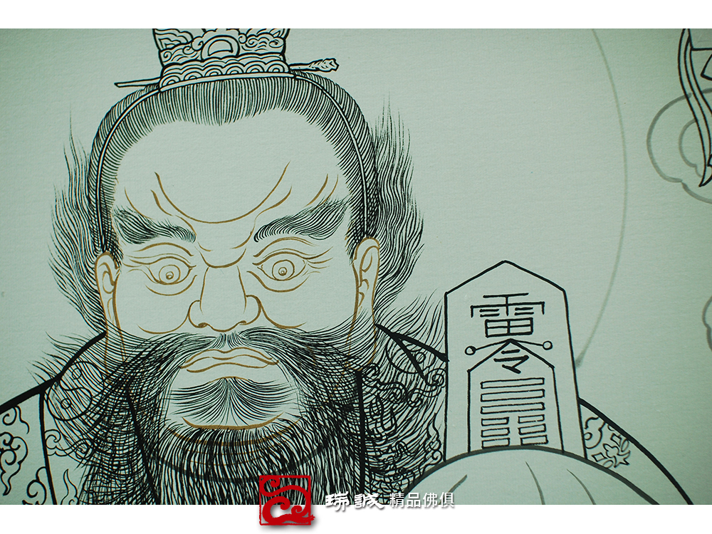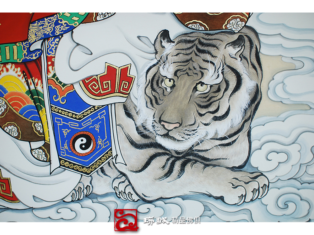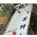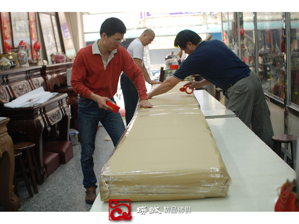 此乃應高雄鳳山賴先生之訂做要求,為一件臨摹作品。一面欣賞別人優良畫作,一面考驗著自己的技巧能力,接案後戰戰兢兢,一筆一畫全神貫注,不一樣的挑戰,一樣的精神為之。配上手寫安金箔立體字及精緻裱框,再搭配賴先生選購的綠檀神桌及燈爐組合,真是絕無僅有的特殊美感!看到賴先生滿意歡喜的笑容,阿玄也覺得安心欣慰。