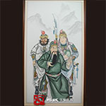 淡彩關公配周倉,關平,背景配上淡墨遠山,氣勢雄偉。