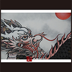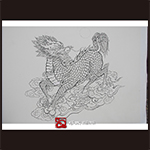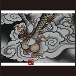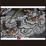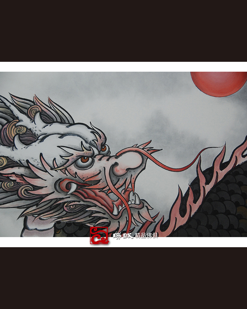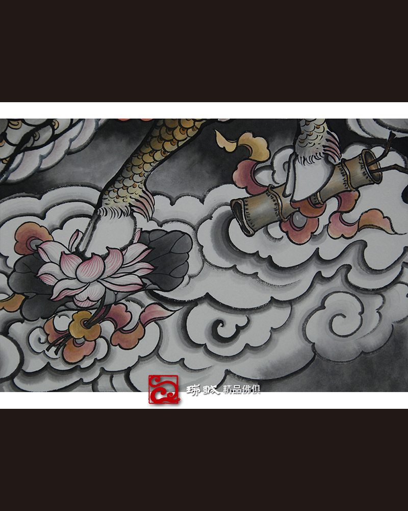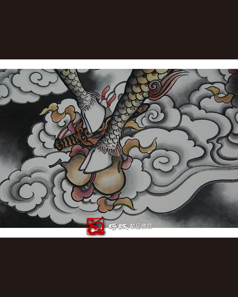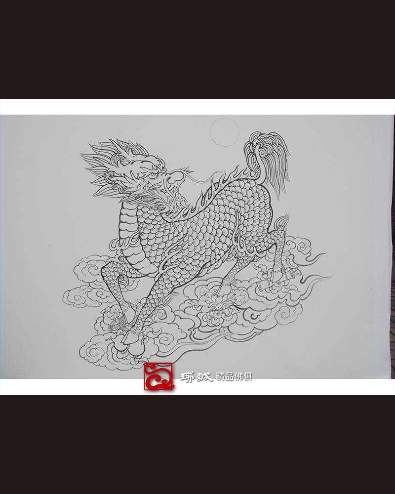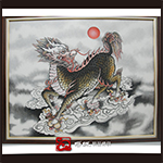 水墨淡彩麒麟,腳踩四寶,騰雲架霧,麒麟雙眼烱烱有神,威震八方。