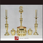 1號銅色免擦全組,三支燈2尺高,八卦爐口徑寬8.8寸,素面檀罐2只。