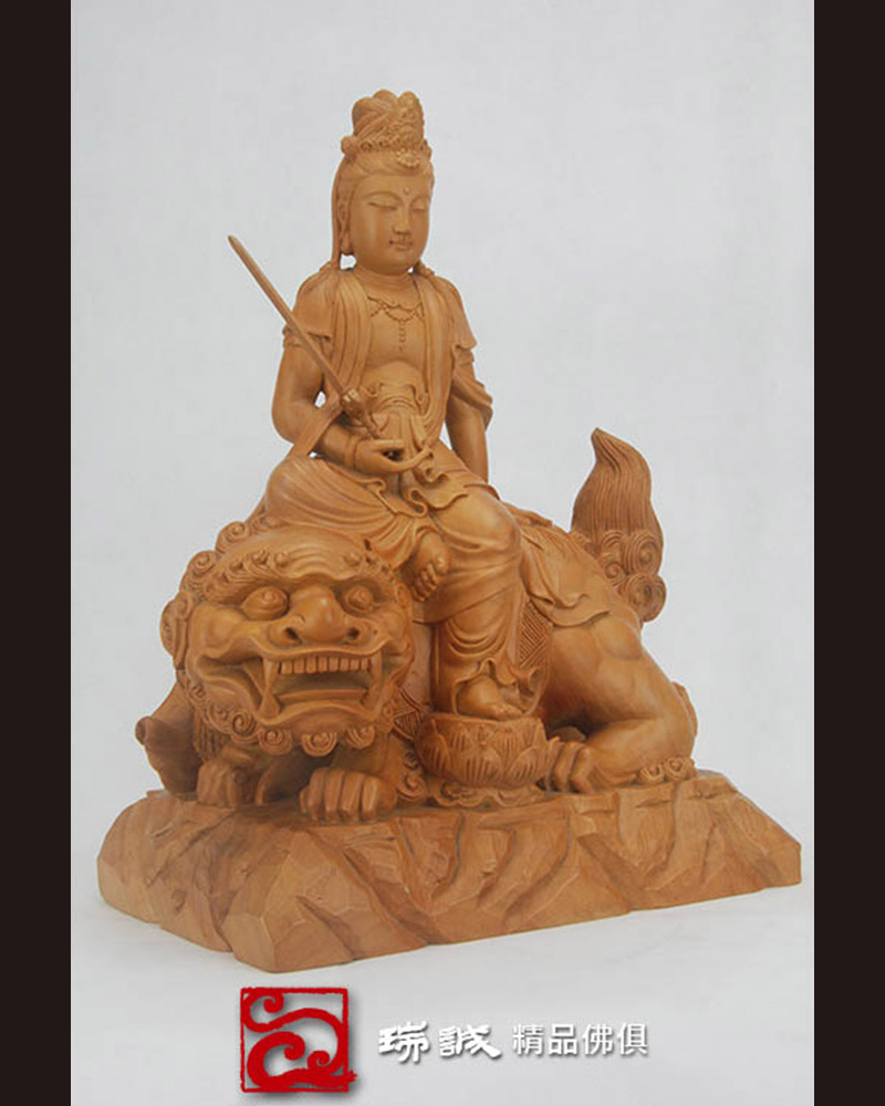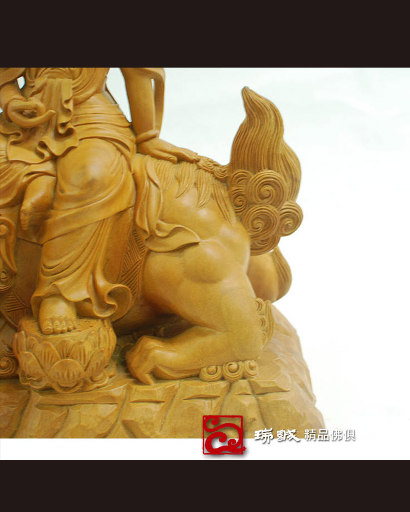 1尺2寸5分文殊菩薩,樟木。整塊木頭紋漂亮,獅子刻工細膩威猛。